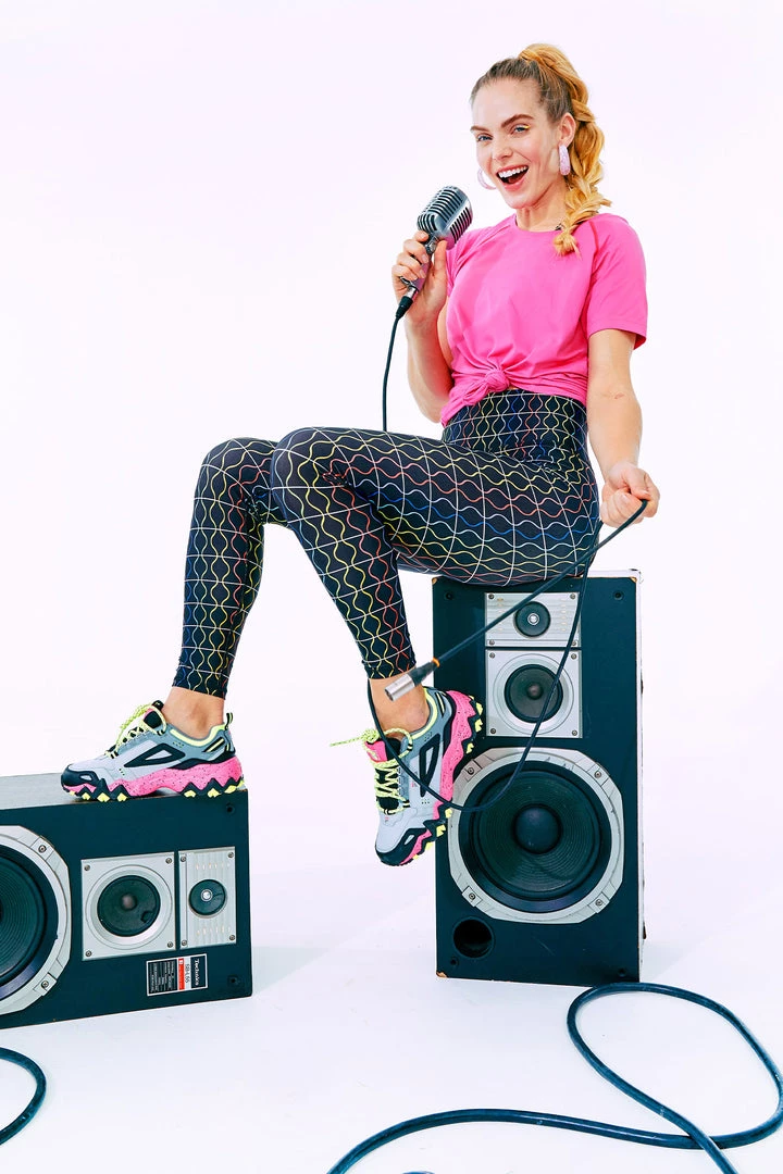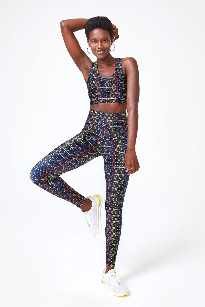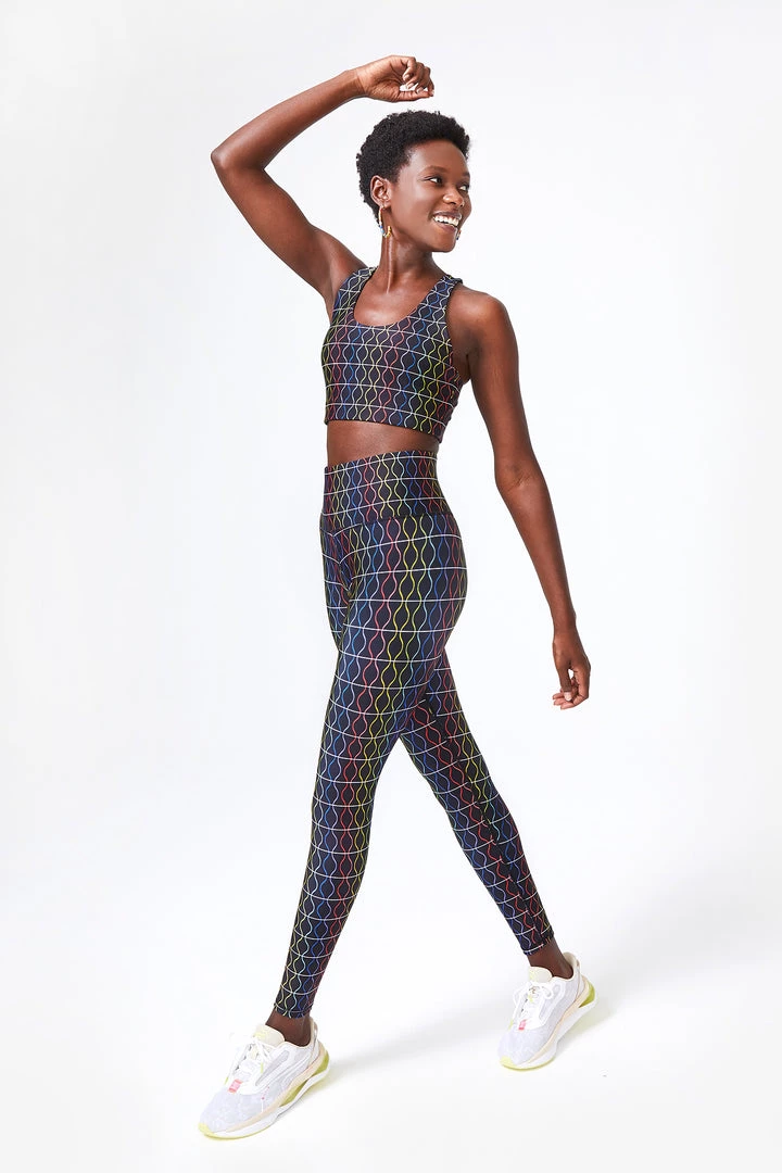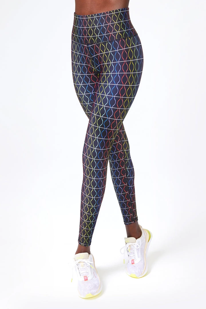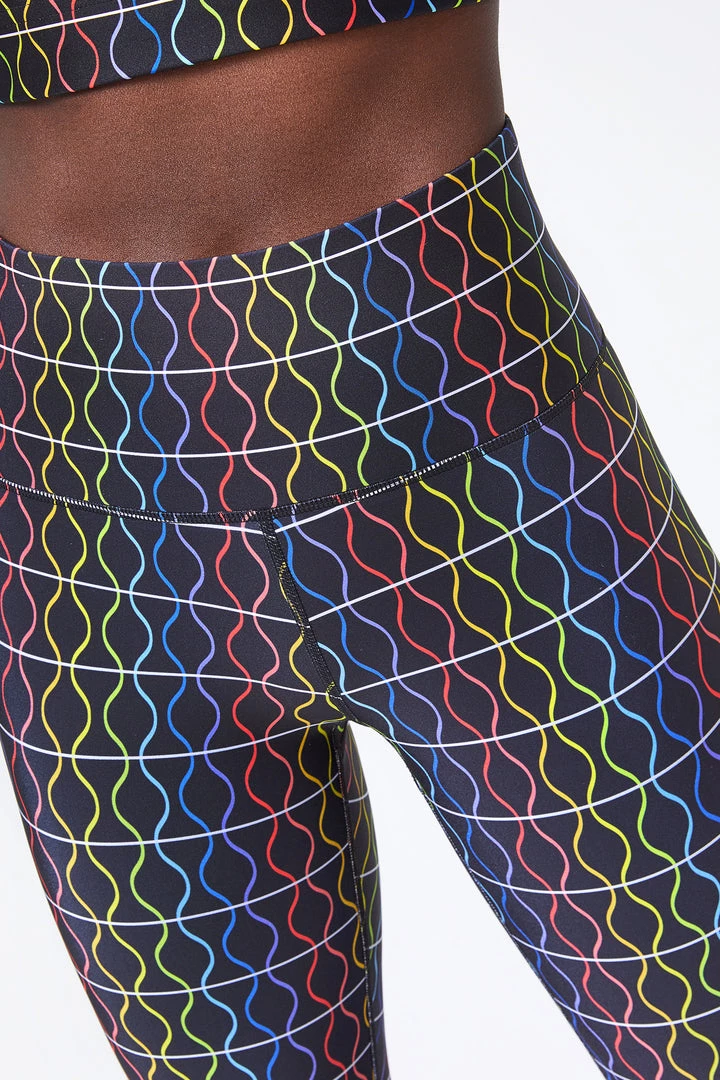 Hold your highest frequency all day long in a boldly patterned legging inspired by the unseen beauty of sound waves. The graduated rainbow finish shines in the light, perfect for your next strobe-lit spin or living room dance party.