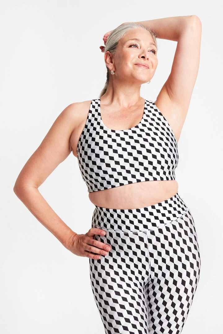 This trompe l’oeil sports bra featuring black and white cubes is a playful Terez take on fall check prints. It has a 3D look and is printed on our Hi-Shine Fabric for extra sheen. This sleek, sweat-wicking racerback is best suited for light cardio and medium-impact workouts.