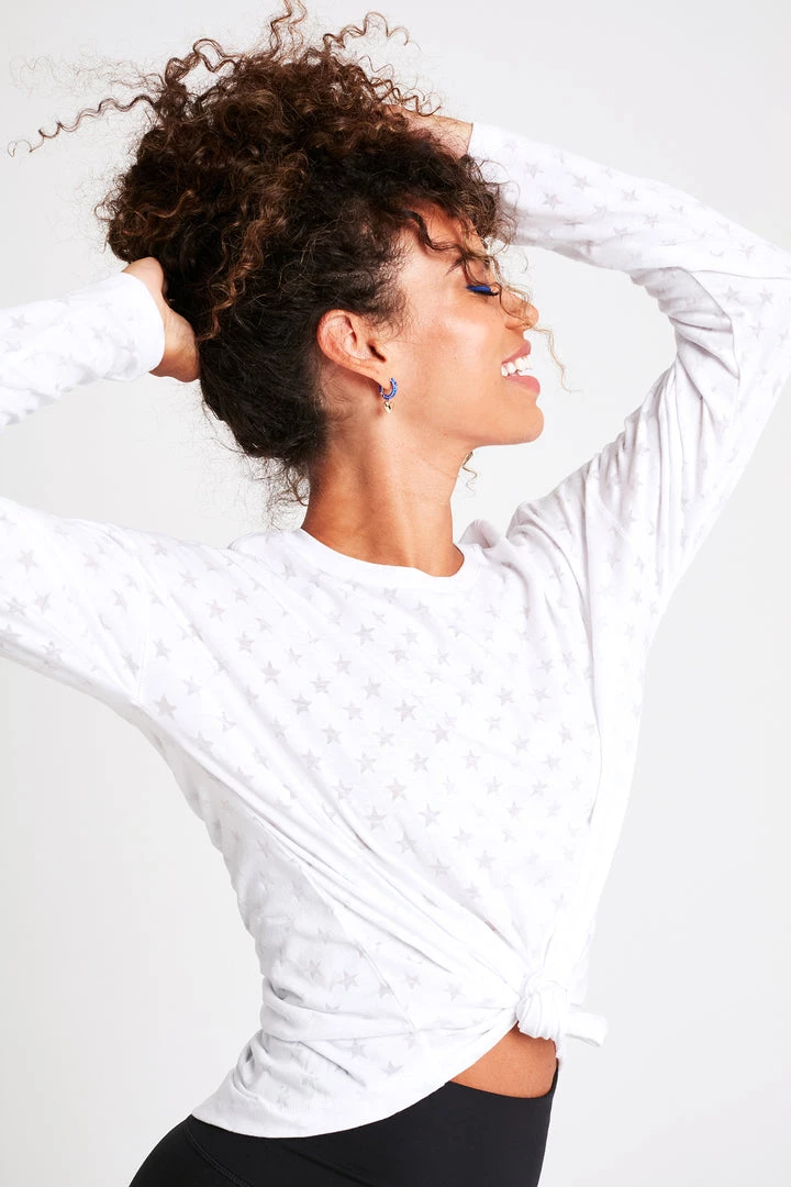 Upgrade your collection of plain white t-shirts with the subtle star textures of our bestselling burnout tops. Made for layering, this long-sleeved style is perfect for warm-ups and cool-downs. It’s equally cute paired with your favorite leggings for staying cozy around town.