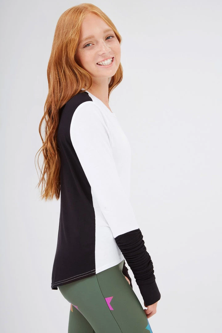 Our new White & Black Ruched Sleeve is comfy, casual and totally cool. We combined scrunches on the black sleeves (ingeniously held in place with elastic) with a white body and a super-soft rayon fabric that makes it easy to wear with everything. Ready for school, for weekend, for anytime!