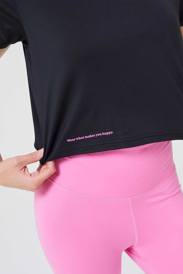 Made from our resilient, sweat absorbing WorkIt fabric, your go-to active tee combines substance and style. The black hue with ‘wear what makes you happy’ detailing adds energy to any workout outfit.