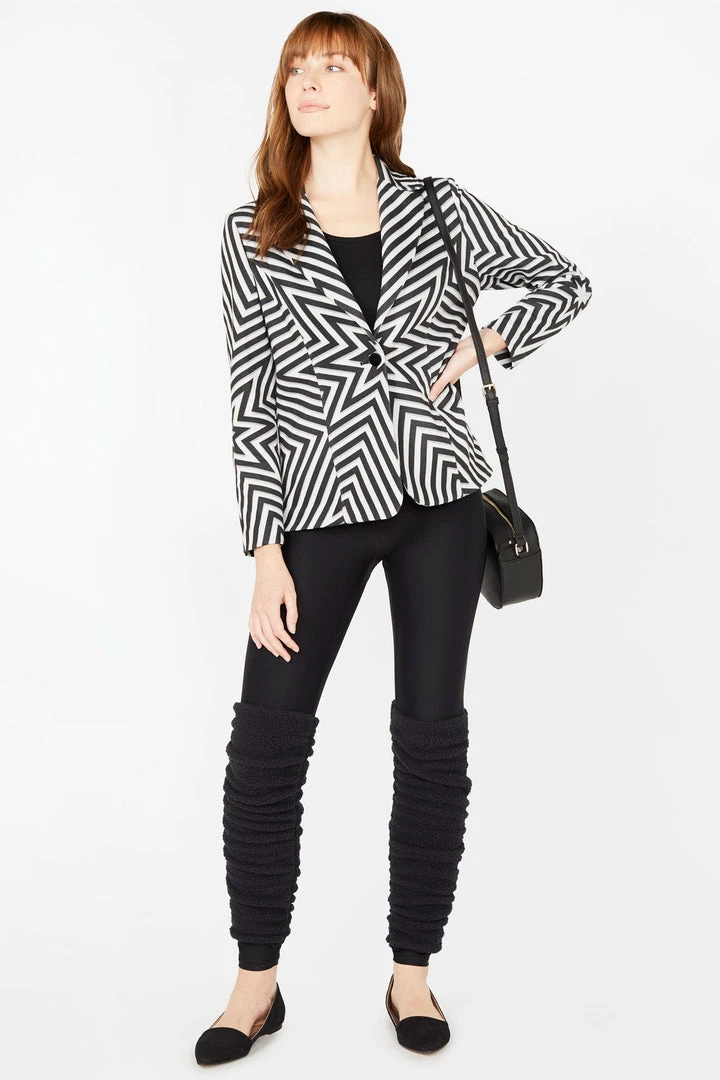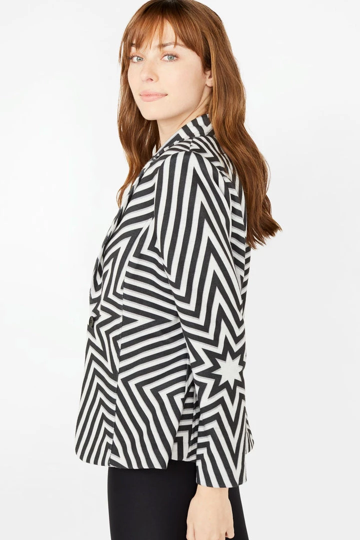 Our notch lapel blazer comes with serious star power. We printed the front and back of this jacket with stars that seem to radiate from the inside out. Inspired by high contrast op art prints and the spiraling geometry of a falling dream.