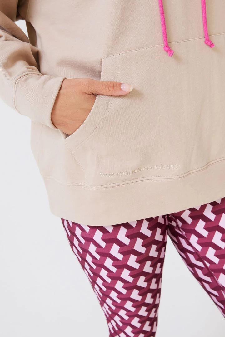 Curl up in our plush oversized hoodie in soft, cream-colored Pima cotton. It’s subtly embroidered with our Empire State Building logo and the affirmation “wear what makes you happy.” Practical finishing touches include an easy-access kangaroo pocket and pop-color drawstrings.
